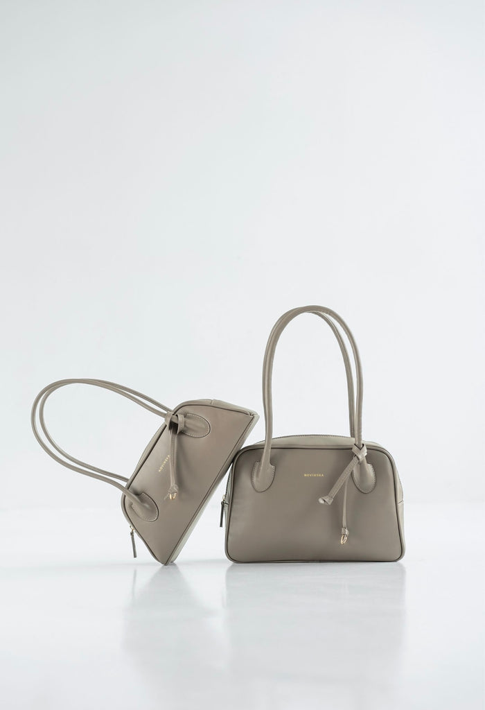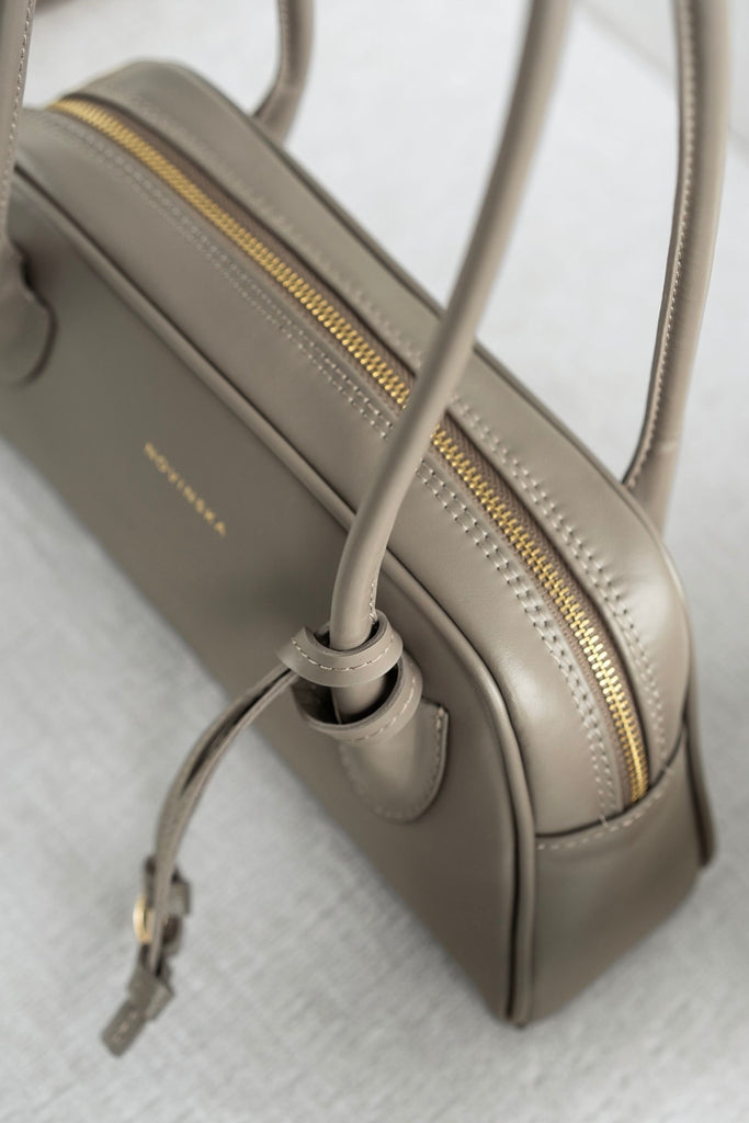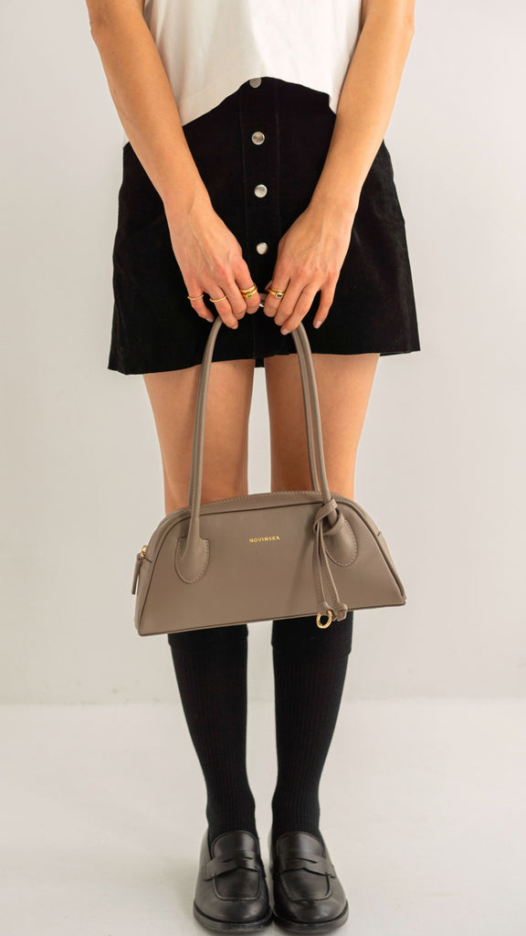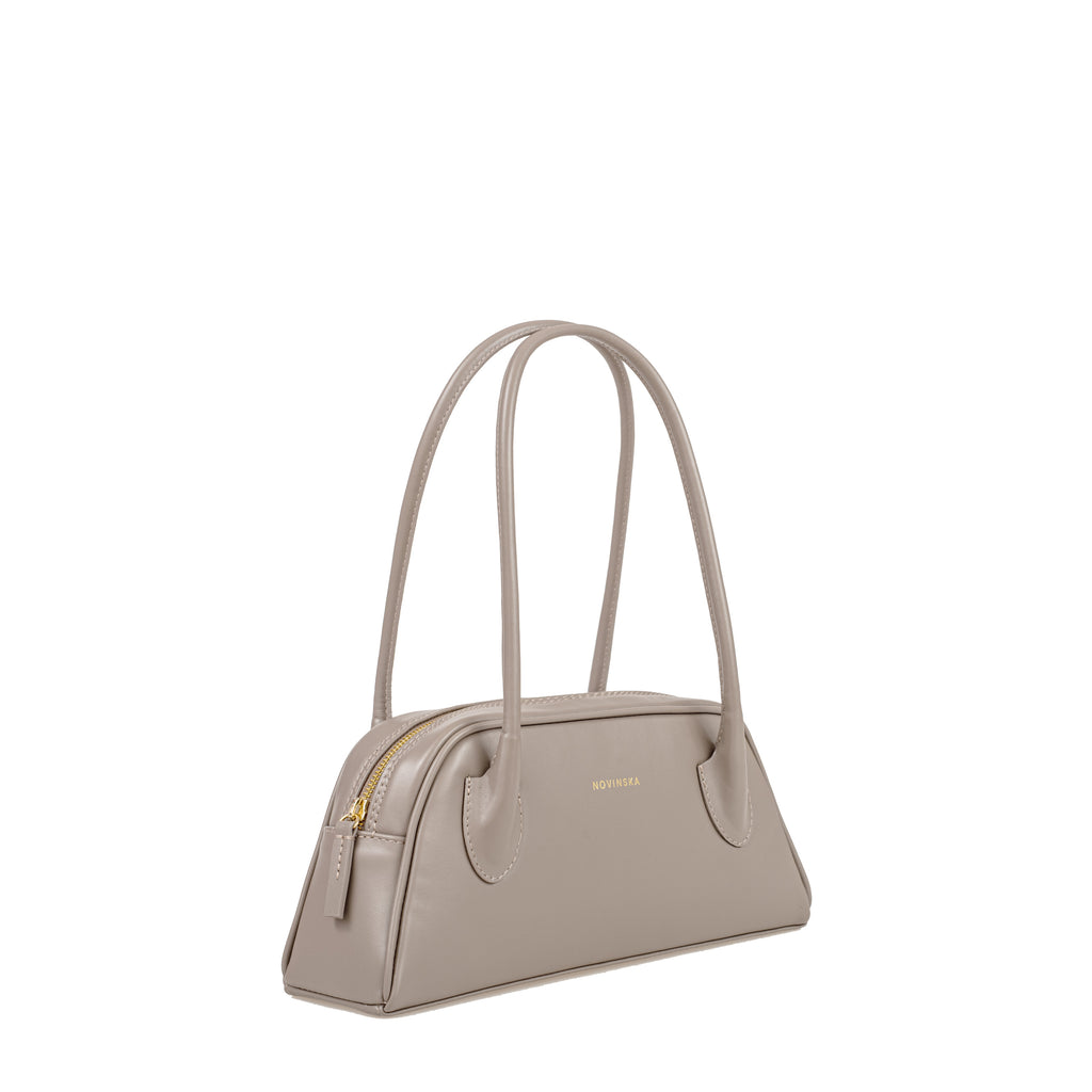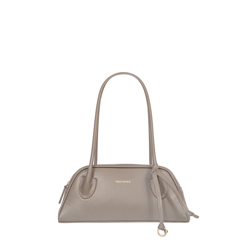 Torebka o trapezowym kształcie, inspirowana sylwetkami lat 90., to połączenie najnowszych trendów z ponadczasową elegancją. Wykonana z gładkiej skóry w kolorze taupe, zachwyca prostotą wyrafinowanego stylu oraz perfekcyjnym wykończeniem. Jej wygodne, długie rączki na ramię są dopracowane w duchu najlepszych technik kaletnictwa, co zapewnia nie tylko komfort noszenia, ale i wyjątkowy charakter. Torebka zapinana na suwak, szeroko się otwiera, ułatwiając dostęp do wnętrza. Subtelnym, ale efektownym akcentem jest ozdobny rzemyk zakończony kółkiem.