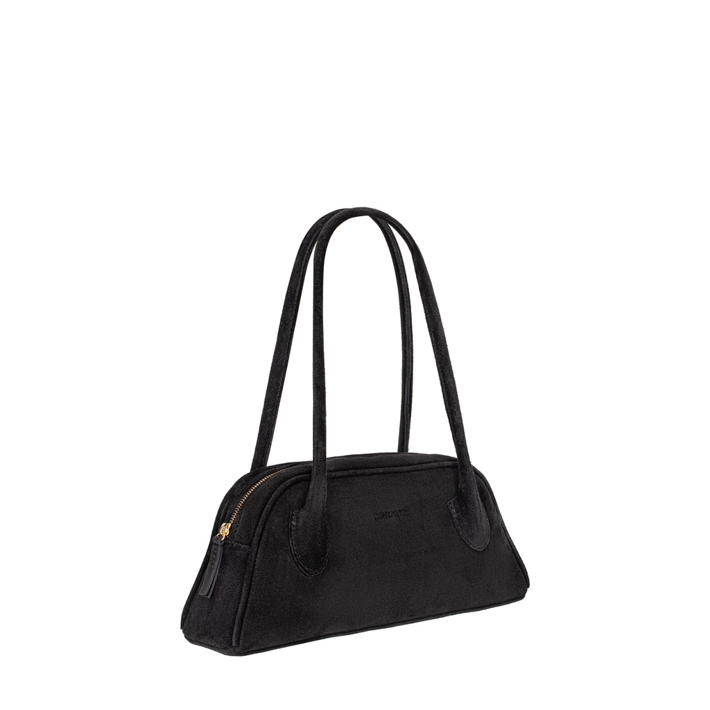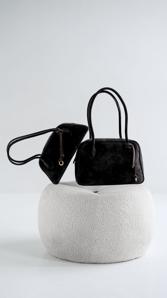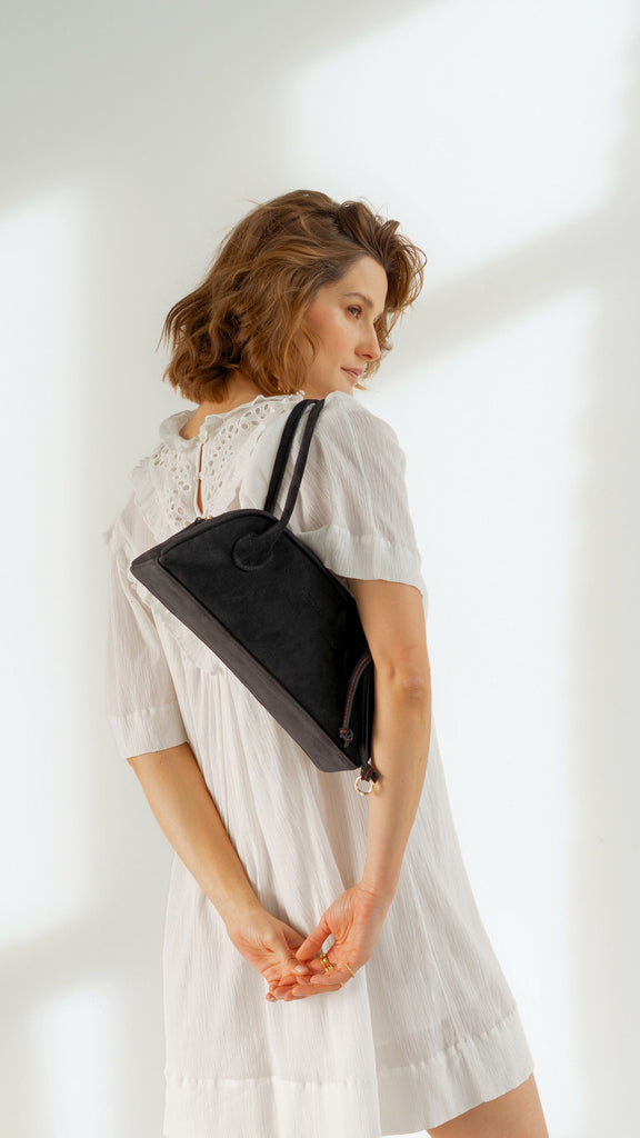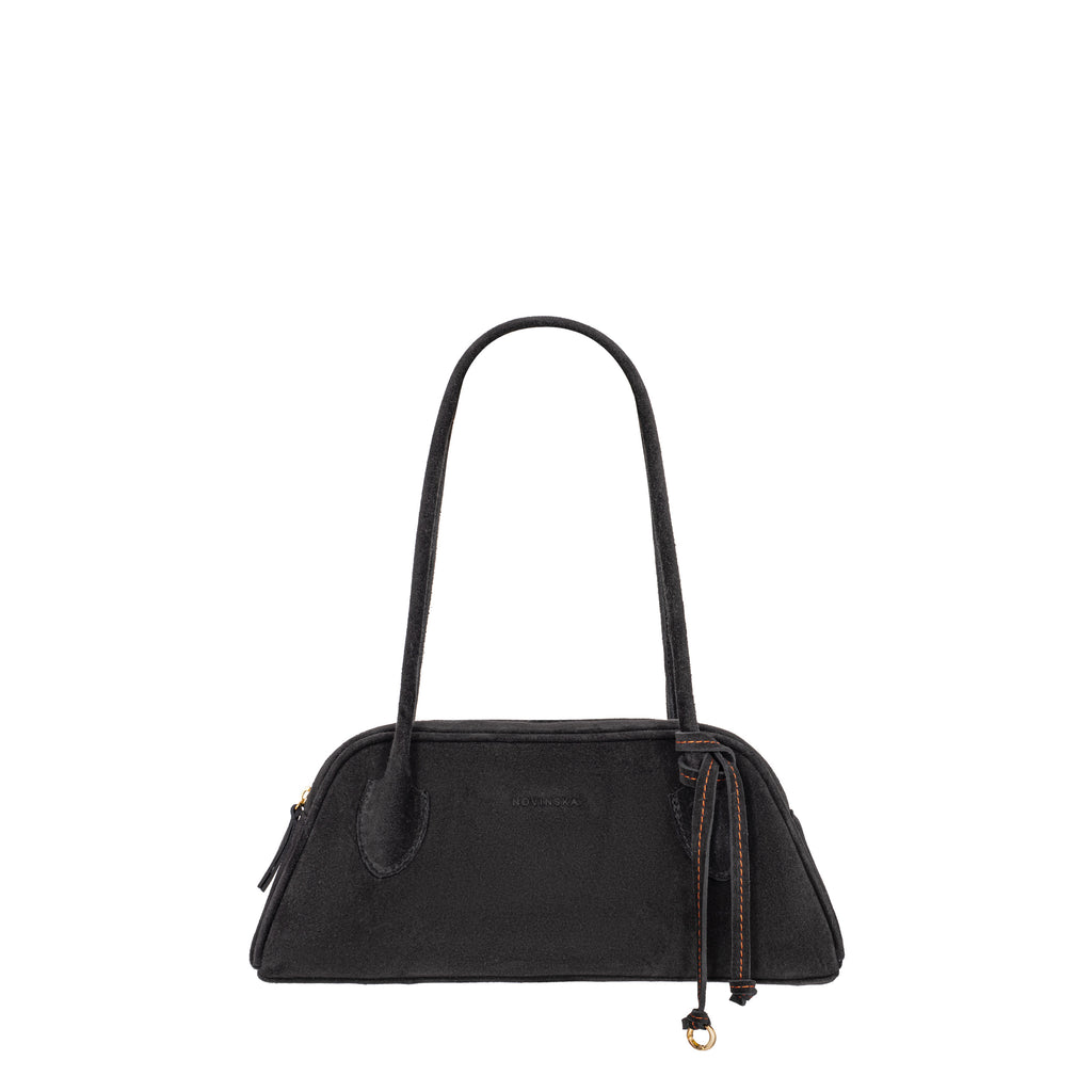 Torebka o trapezowym kształcie, inspirowana sylwetkami lat 90., to połączenie najnowszych trendów z ponadczasową elegancją. Wykonana z impregnowanej włoskiej skóry zamszowej w głębokim czarnym kolorze, zachwyca prostotą wyrafinowanego stylu oraz perfekcyjnym wykończeniem. Jej wygodne rączki na ramię są dopracowane w duchu najlepszych technik kaletnictwa, co zapewnia nie tylko komfort noszenia, ale i wyjątkowy charakter. Torebka zapinana na suwak, szeroko się otwiera, ułatwiając dostęp do wnętrza. Subtelnym, ale efektownym akcentem jest ozdobny rzemyk z charakterystycznym dla marki pomarańczowym przeszyciem.