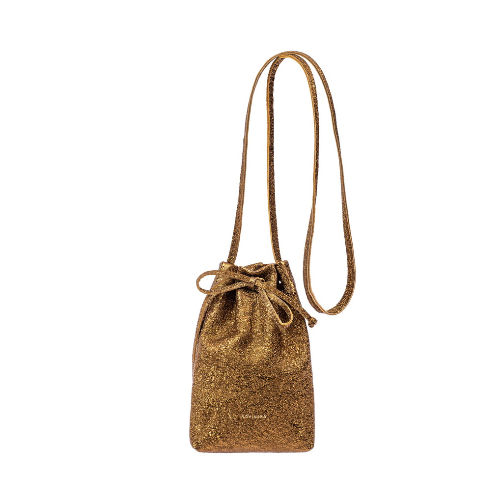 Śliczny woreczek - sakiewka na telefon i inne niezbędne przedmioty. Idealny na co dzień i na imprezę. Wykonany z metalicznej skóry merynosa o charakterystycznej, niejednolitej fakturze. W kolorze złotym.