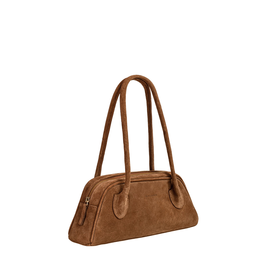 Torebka o trapezowym kształcie, inspirowana sylwetkami lat 90., to połączenie najnowszych trendów z ponadczasową elegancją. Wykonana z zamszowej skóry w kolorze koniakowym i wykończona biżuteryjnym suwakiem w złotym kolorze, zachwyca prostotą wyrafinowanego stylu oraz perfekcyjnym wykończeniem. Jej wygodne, długie rączki na ramię są dopracowane w duchu najlepszych technik kaletnictwa, co zapewnia nie tylko komfort noszenia, ale i wyjątkowy charakter. Torebka zapinana na suwak, szeroko się otwiera, ułatwiając dostęp do wnętrza. Subtelnym, ale efektownym akcentem jest ozdobny rzemyk zakończony kółkiem.