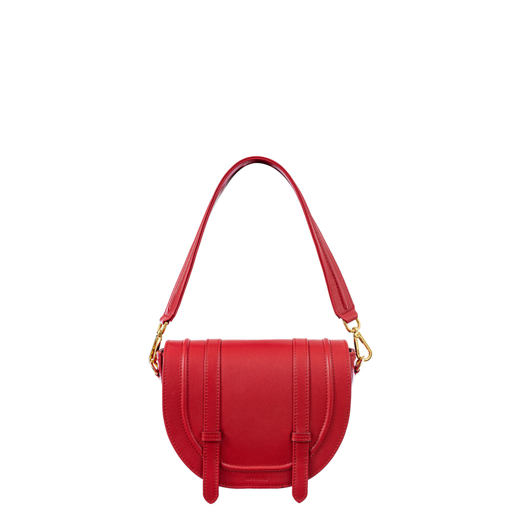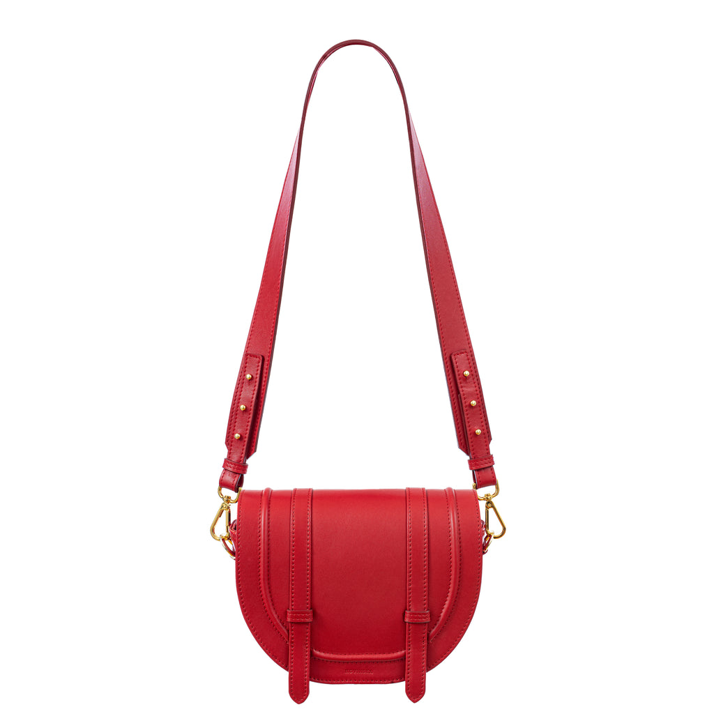 Torebka w kształcie półksiężyca z charakterystycznymi dla marki NOVINSKA zdobieniami. Usztywniana, wykonana została z gładkiej skóry bydlęcej w pięknym odcieniu czerwieni. Kompaktowa forma torebki pomieści niezbędne przedmioty codziennego użytku. Można ją nosić na krótkiej skórzanej rączce ozdobionej wypukłą "duszką" lub na skos na szerokim i regulowanym pasku ze skóry.