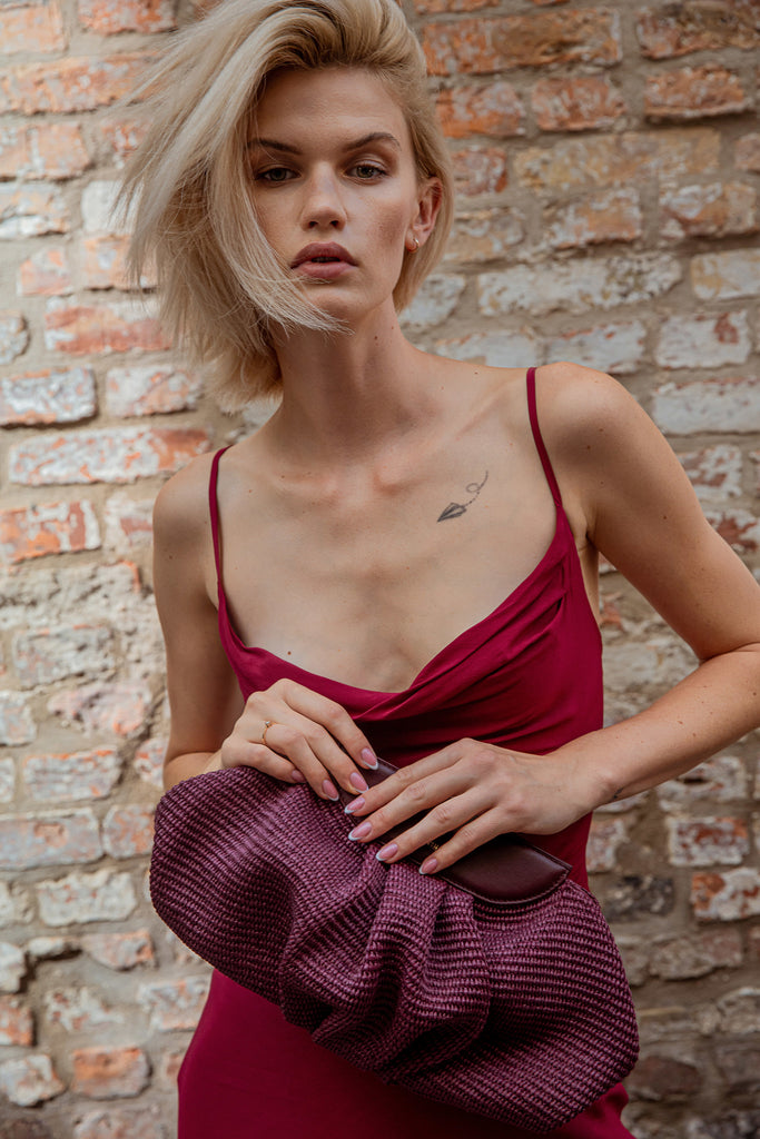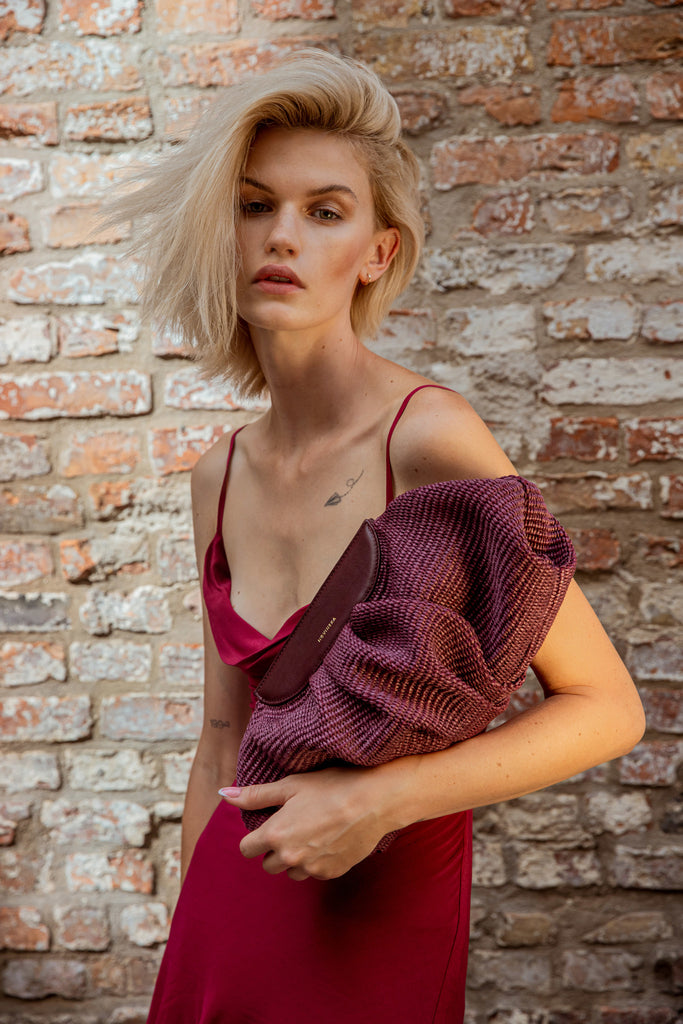 Torebka, której zaprojektowanie i wykonanie zajęło nam wiele bezsennych nocy, ale finalny efekt mówi sam za siebie. Szykowna, a zarazem łatwa w noszeniu: spełnia funkcję maxi koperty do ręki lub torebki na ramię lub noszona na skos. I taka właśnie jest ta torebka wykonana z plecionej włoskiej tkaniny o naturalnym składzie i wykończona skórą bydlęcą. Elegancki kolor burgundu raffii dodaje torebce szyku. Lekka i pojemna, zapinana na dwa kryte magnesy, z doczepianym skórzanym paskiem w komplecie. Przełamana klasyka, która jest znakiem rozpoznawczym marki NOVINSKA.
