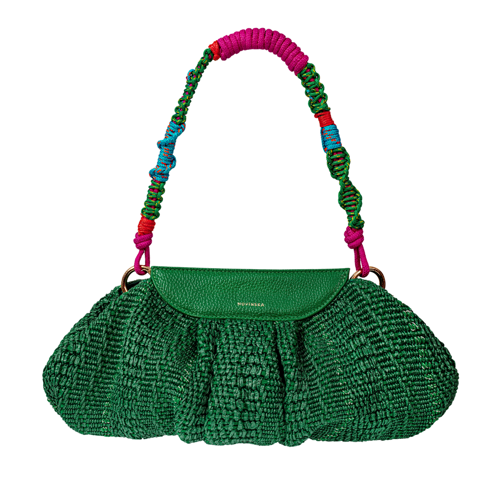 Spełnia funkcję maxi koperty do ręki lub torebki na ramię lub noszona na skos. I taka właśnie jest ta torebka wykonana z plecionej włoskiej tkaniny o naturalnym składzie i wykończona skórą z fakturą groszku. Soczysty zielony kolor raffii i skóry w tym samym odcieniu jest naszym hitem sprzedaży. Lekka i pojemna, zapinana na dwa kryte magnesy, z doczepianym cienkim paskiem skórzanym. Przełamana klasyka, która jest znakiem rozpoznawczym marki NOVINSKA.