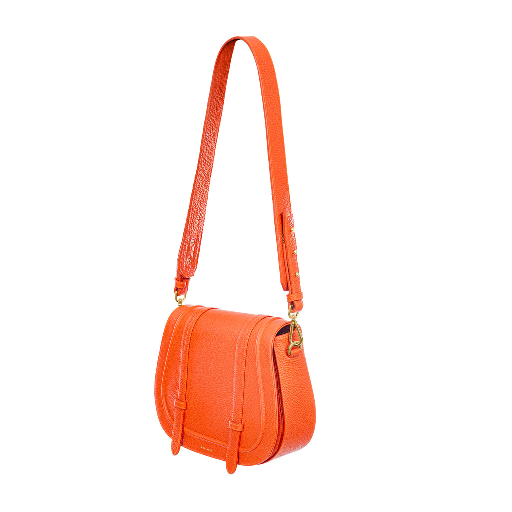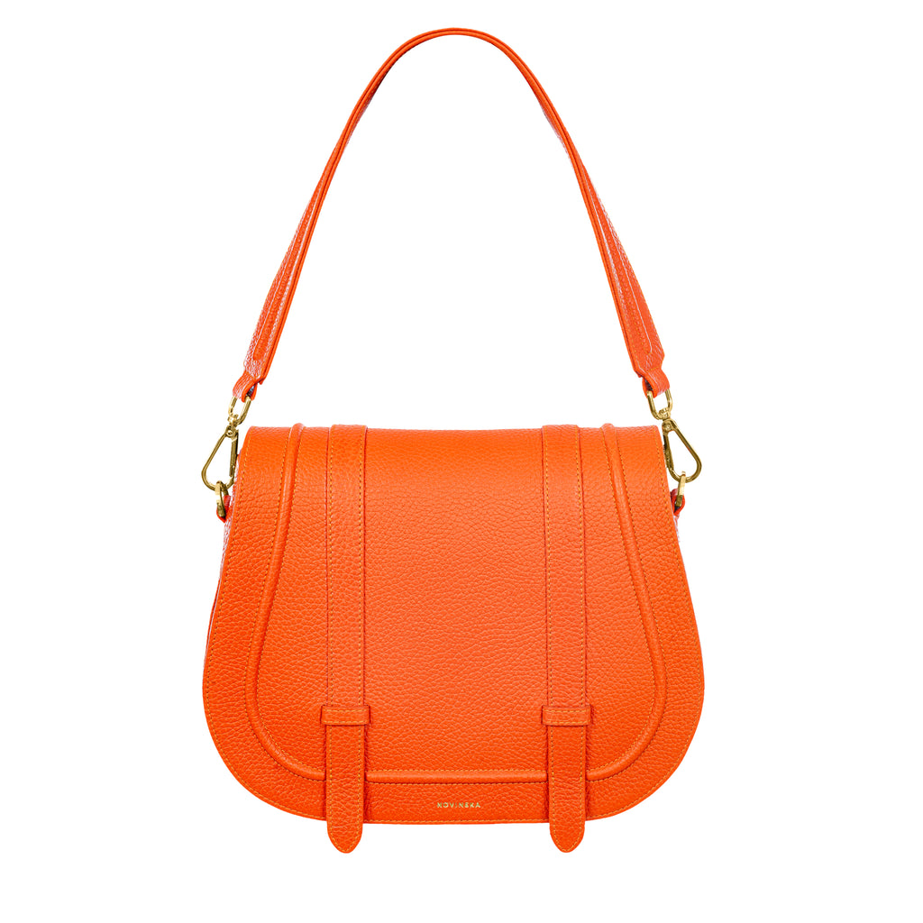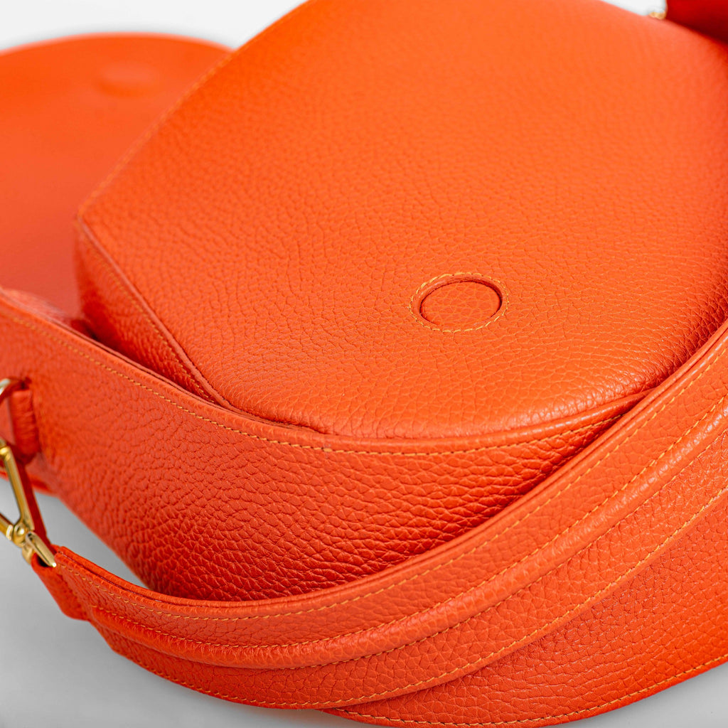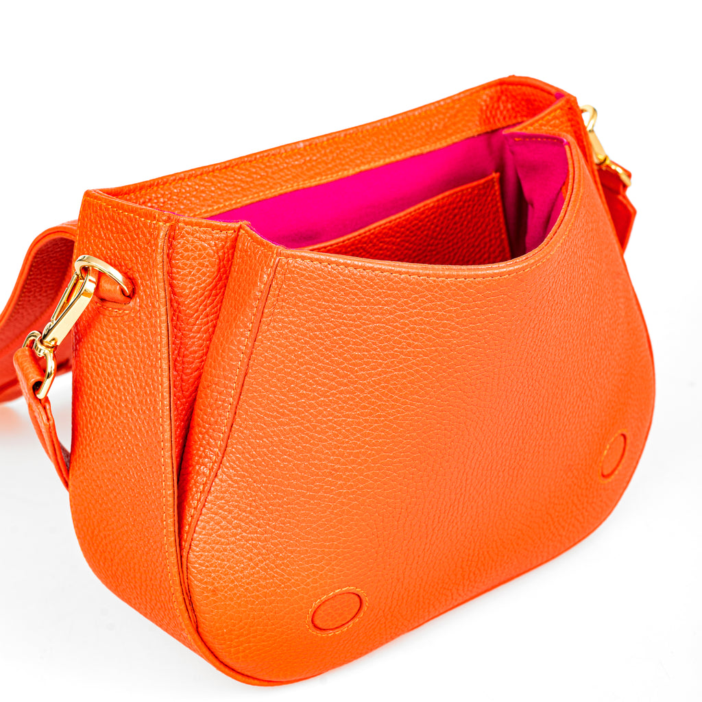 Usztywniana torebka w kształcie dużej podkowy to nasz charakterystyczny model, który zyskał status IT-Bag. W tej pięknej pomarańczowej skórze z fakturą groszku nabiera nowego życia. Torebka w tym kolorze została dodatkowo wzbogacona "skrzydełkami", które sprawiają, że wejście do torebki jest szersze, a torebka bardziej pojemna. Wygodnie zapinanan na dwa kryte magnesy. Świetnie sprawdzi się na co dzień i z pewnością doda szyku i elegancji wielu stylizacjom. Możesz ją nosić na krótkiej rączce na ramię ozdobionej wypukłą "duszką" lub na dodatkowym długim regulowanym pasku, na skos. Zawsze wygląda jak milion dolarów.