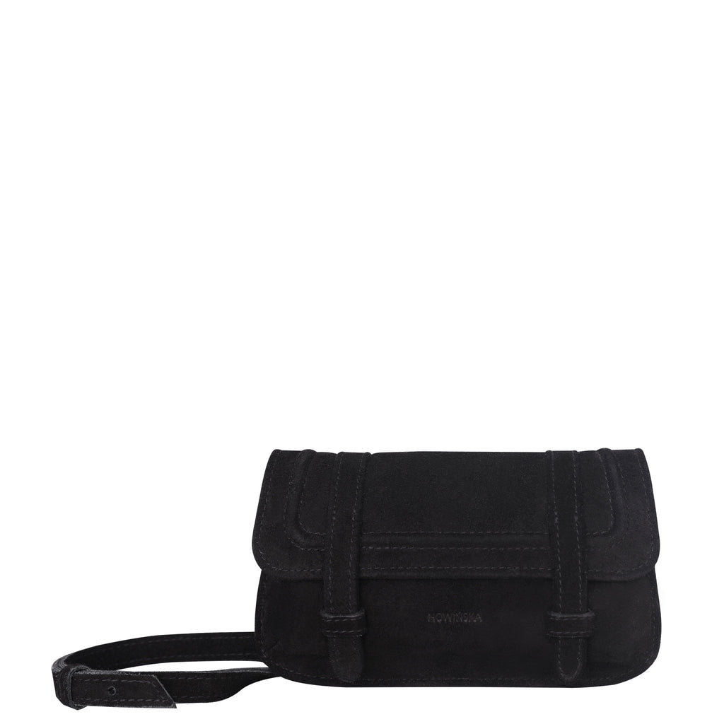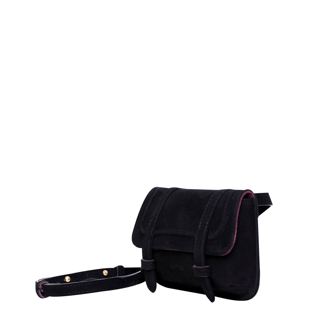 No. 108 mini bag from ARMOUR collection in signature two-tones combination. Made from black suede leather with burgundy details. Lined in contrasting bordo tones. It can be styled in two different ways: worn around your waist or cross-body using the detachable strap. This suede leather bag is the must have for fall coats and over the knee boots and will spice up any outfit.