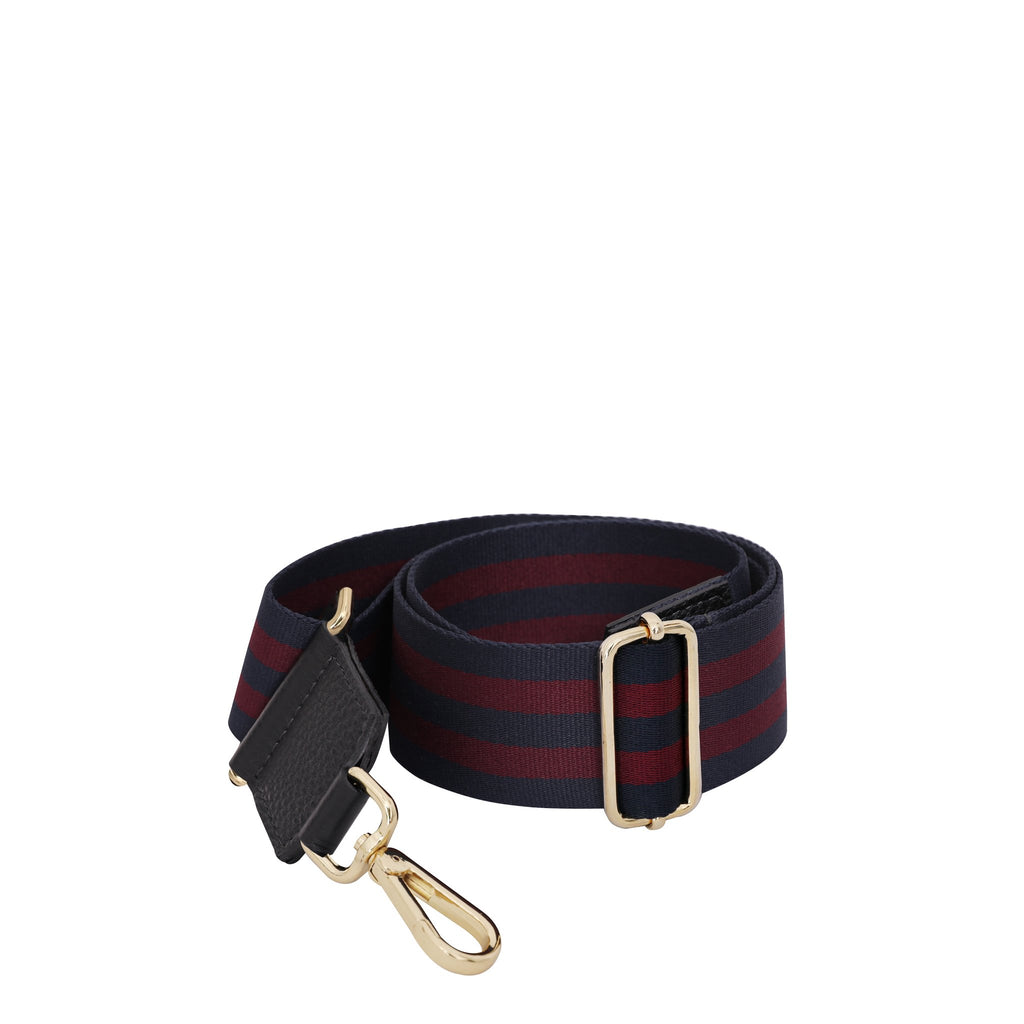 Two tone canvas strap in navy and burgundy color is both chic and smart causal. This woven tape was made in Italy and it has a luxury feel. Trimmed with leather and adorned with lux golden hardware. Versatile and practical. You can pair it with many handbags taken out from your wardrobe and give them new life.