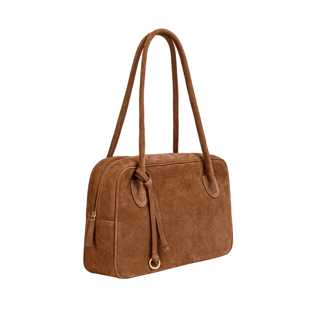 Bowling Bag Medium o prostokątno-trapezowej formie to wyrazista, modowa sylwetka. Wykonana z włoskiego zamszu w pasującym do wielu stylizacji koniakowym brązie.